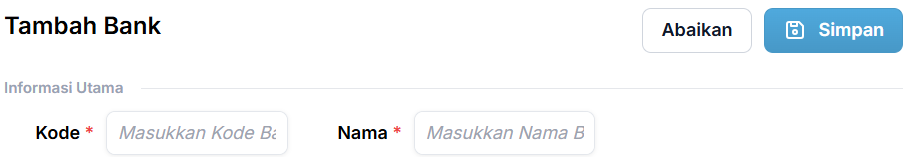Nama Field Keterangan Kode Sebagai identifikasi unik untuk membedakan setiap entitas atau data secara spesifik. Nama Menyimpan informasi nama Bank. - Apabila field sudah diisi, cek kembali lalu klik Save untuk menyimpan.