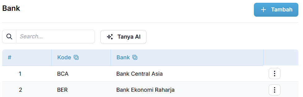 - Setelah di Simpan, list bank akan ditampilkan sesuai gambar ini: