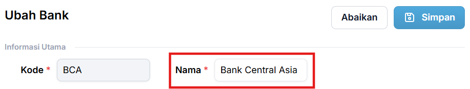 - Klik Simpan untuk menyimpan perubahan informasi nama bank.