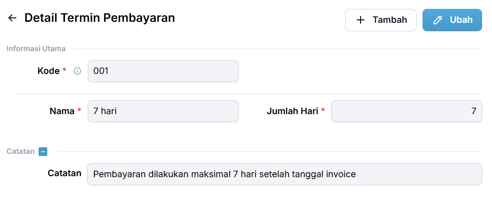 Nama Field Keterangan Kode Kode unik yang digunakan untuk mengidentifikasi jangka waktu pembayaran. Nama Nama untuk identifikasi jangka waktu pembayaran. Jumlah Hari Keterangan jumlah hari. Catatan Tempat untuk menyimpan informasi tambahan atau keterangan yang relevan terkait data. - Apabila field sudah diisi, cek kembali lalu klik Save untuk menyimpan.