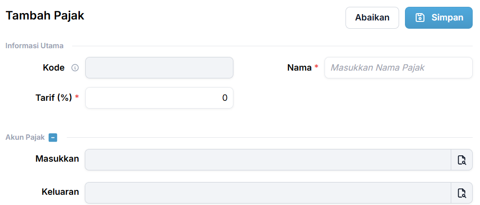 Nama Field Keterangan Kode Kode unik yang digunakan untuk mengidentifikasi jenis pajak secara spesifik dalam sistem. Nama Nama lengkap atau deskripsi jenis pajak, misalnya PPh 21, PPN, Pajak Penghasilan, yang menjelaskan kategori pajak tersebut. Tarif Persentase atau nilai tetap yang digunakan untuk menghitung besaran pajak berdasarkan dasar pengenaan pajak. Contohnya, 10% untuk PPN. Masukkan Menandai apakah ini pajak yang dikenakan atau dipungut (input ke sistem), misalnya pajak yang harus ditambahkan pada harga barang atau jasa. Keluaran Menunjukkan apakah pajak ini adalah pengeluaran atau pajak yang harus dibayarkan oleh perusahaan (output) seperti pajak yang dipotong dari gaji karyawan (PPh 21)