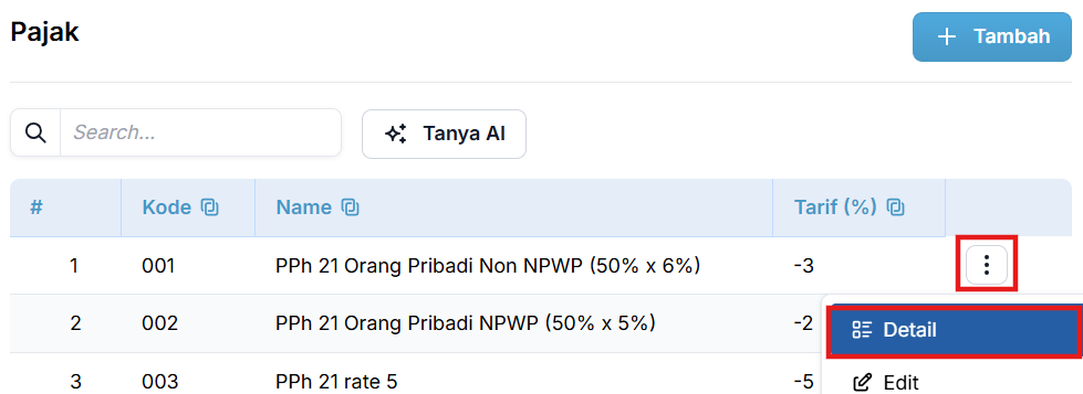 - Klik titik tiga di bagian kanan informasi pajak. Titik tiga ini merupakan More Options yang terdiri dari pilihan Details dan Edit.
