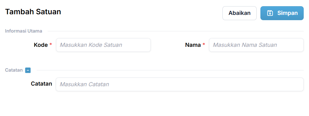 Nama Field Keterangan Kode Sebagai identifikasi unik untuk membedakan setiap entitas atau data secara spesifik. Nama Menyimpan informasi nama satuan. Catatan Tempat untuk menyimpan informasi tambahan atau keterangan yang relevan terkait data. - Apabila field sudah diisi, cek kembali lalu klik Save untuk menyimpan.