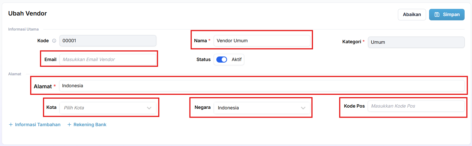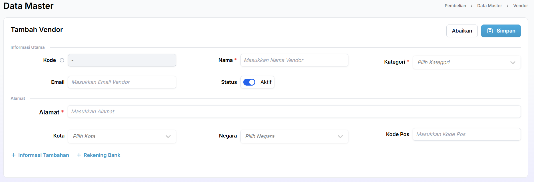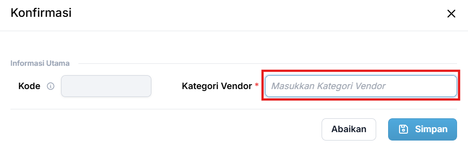 Informasi Utama :Tanda * merupakan tanda mandatory/wajib diisi sebelum disimpan.Nama Field Keterangan Kode Kode otomatis yang akan terbentuk saat vendor disimpan, digunakan identifikasi unik vendor. Nama Nama lengkap vendor. Kategori Pilihan pengelompokan vendor berdasarkan jenis atau kriteria. Email Alamat email milik vendor yang digunakan sebagai media komunikasi dan notifikasi. Status Menandai kondisi aktif/tidak aktif vendor. Isikan Alamat :Anda dapat menambahkan Kategori Vendor dengan cepat melalui field kategori lalu klik Tambah Item. Maka akan muncul pop up berikut ini:Masukkan Kategori Vendor, lalu klik Simpan.