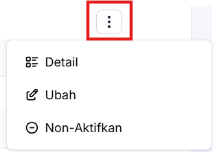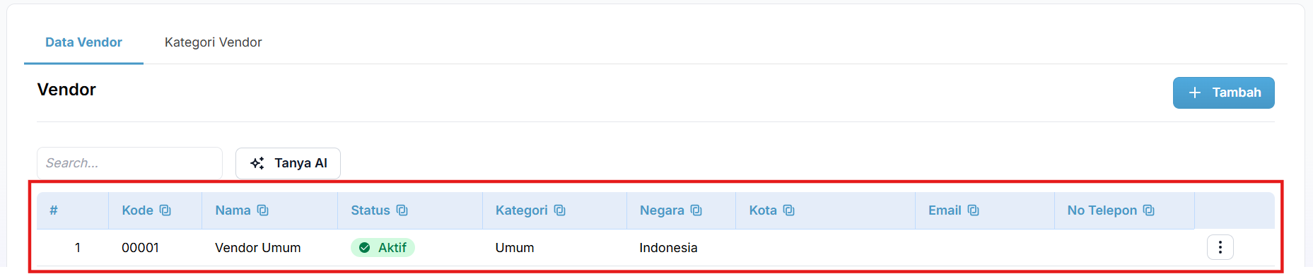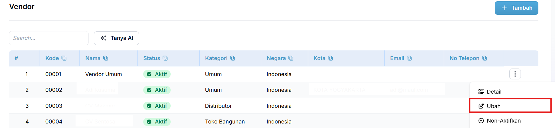 Field Kode dan Kategori tidak dapat diubah kembali.Ketika Vendor Tidak Aktif Lagi atau Divisi terkait (misal procurement, legal, atau finance) meminta penonaktifan vendor karena alasan tertentu, seperti audit, efisiensi, atau restrukturisasi data. Hal ini dapat dilakukan dengan menonaktifkan status vendor dengan Ubah Vendor. Atau dapat juga menggunakan titik tiga disamping:Non-Aktifkan : Menonaktifkan data, menu, atau fitur agar tidak aktif atau terlihat oleh pengguna biasa.