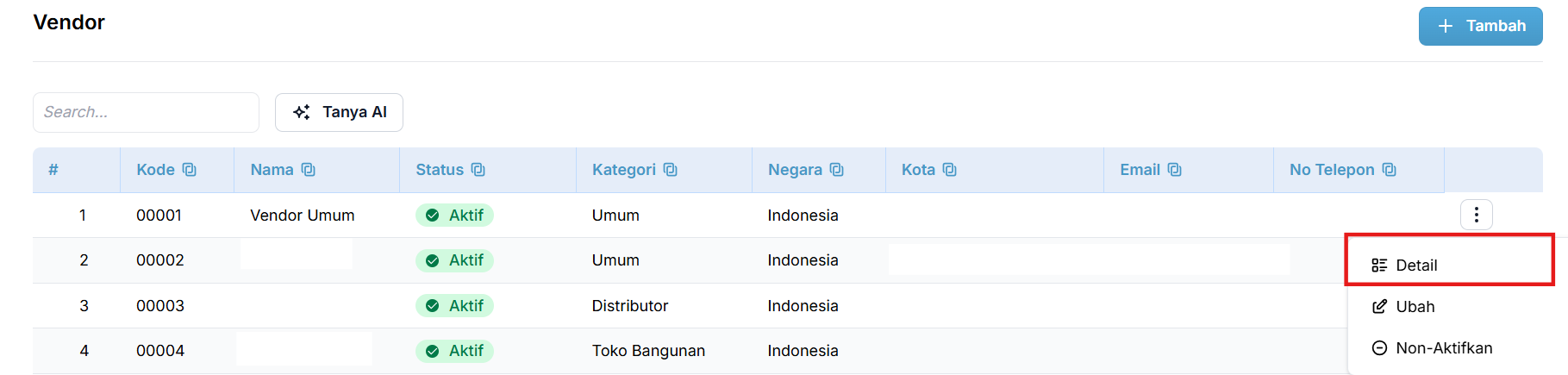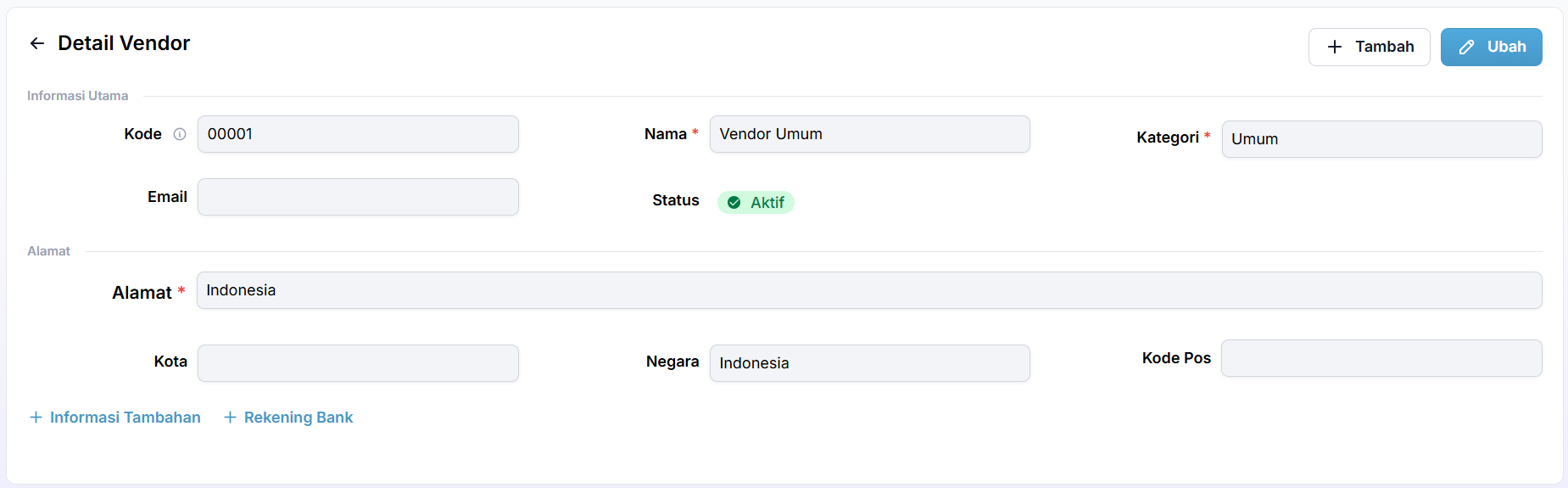 Pada tampilan detail akan terlihat informasi utama dan alamat vendor. Pada tampilan detail akan terlihat status dokumen Aktif atau Non-Aktif.